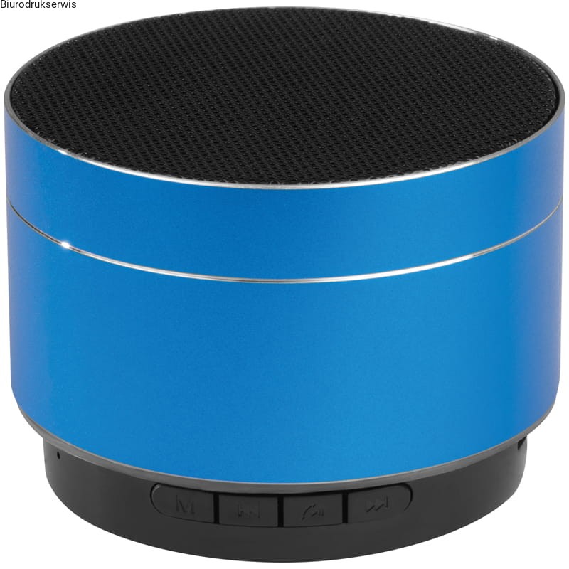 Okrągły głośnik bluetooth w aluminium z wbudowanym akumulatorem, wbudowanym radiem, gniazdem karty TF i migającym światłem LED na dole. W zestawie kabel do ładowania micro-USB.