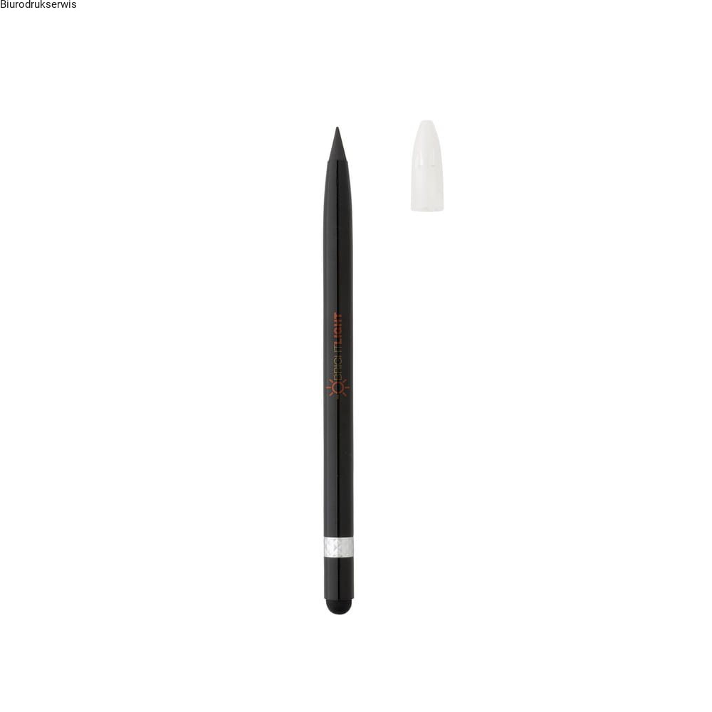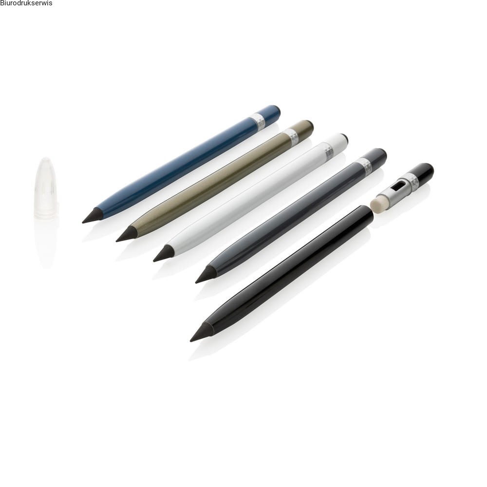 "Wieczny" ołówek z gumką, aluminiuowy trzon, dzięki wykorzystaniu specjalnej wolnościerającej się grafitowej końcówki długość pisania ołówka to około 20 000 metrów, notatki można zmazać standardową gumką do mazania
