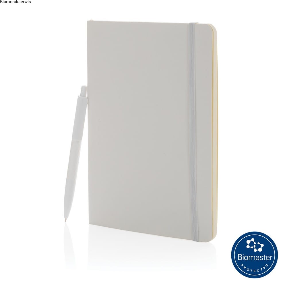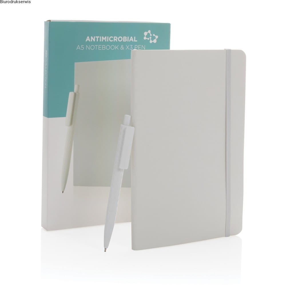 Zestaw antybakteryjny, notatnik z miękką okładką (72 kremowe strony w linie o gramaturze 70g/m2) i długopis, , niemiecki wkład Dokumental® w kolorze niebieskim w komplecie, długość pisania ok. 1200 m, kulka TC zapewnia wygodne pisanie, materiał z których zostały wykonane produkty poddany działaniu przeciwbakteryjnego środka Biomaster, który zapewnia drugą linię obrony przed bakteriami (środek znajduje się w produkcie w związku z czym ochrona jest permanentna), bezpieczny i nieszkodliwy dla użytkownika, spełnia wymagania normy ISO 22196, produkt posiada również wbudowany znacznik Verimaster, który ma na celu udowodnienie dodatku środka Biomaster