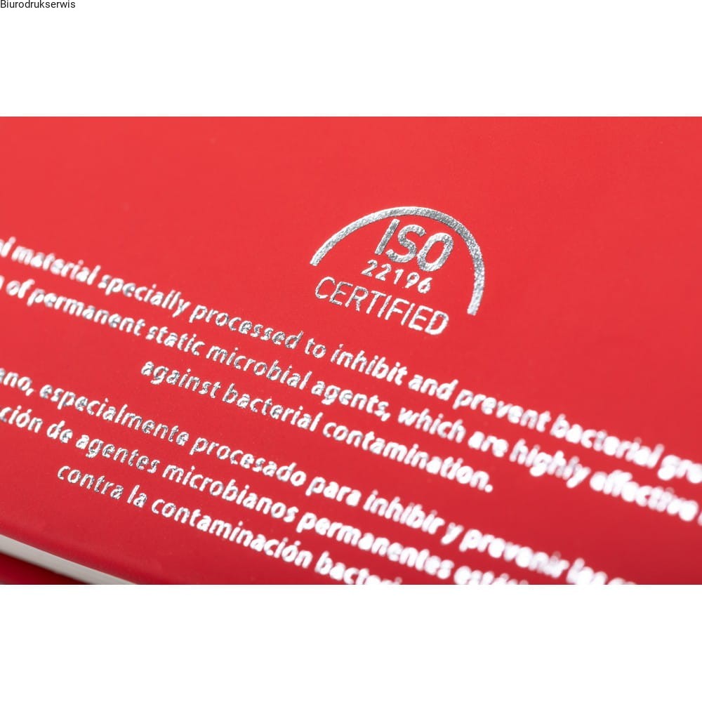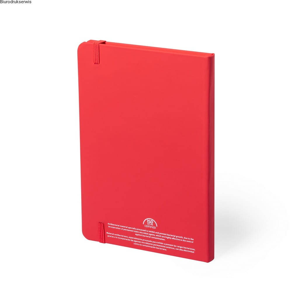 Antybakteryjny notatnik A5 (100 pustych kartek), twarda okładka i elastyczna opaska do zamykania, tasiemka zakładkowa, spełnia wymagania normy ISO 22196