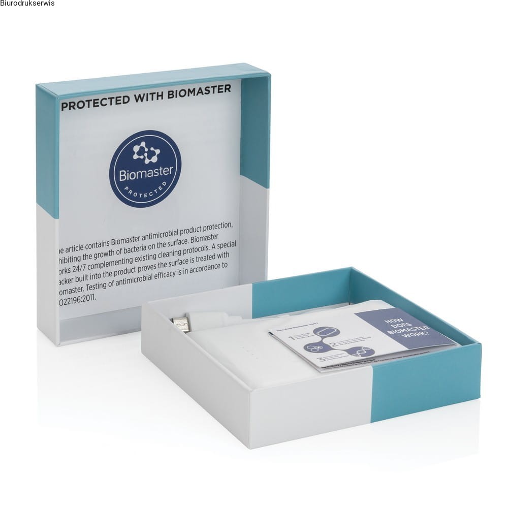 Antybakteryjny power bank 5000 mAh, 4 diody LED wskazujące poziom naładowania, wbudowany akumulator klasy A umożliwia naładowanie telefonu do 3 razy, wejście micro USB 5V/2A, wyjście 5V/2A, produkt wykonany został z ABS, które zostało poddane działaniu przeciwbakteryjnego środka Biomaster, który zapewnia drugą linię obrony przed bakteriami (środek znajduje się w produkcie w związku z czym ochrona jest permanentna), bezpieczny i nieszkodliwy dla użytkownika, spełnia wymagania normy ISO 22196, produkt posiada również wbudowany znacznik Verimaster, który ma na celu udowodnienie dodatku środka Biomaster, w pudełku podarunkowym z opisem Biomaster
