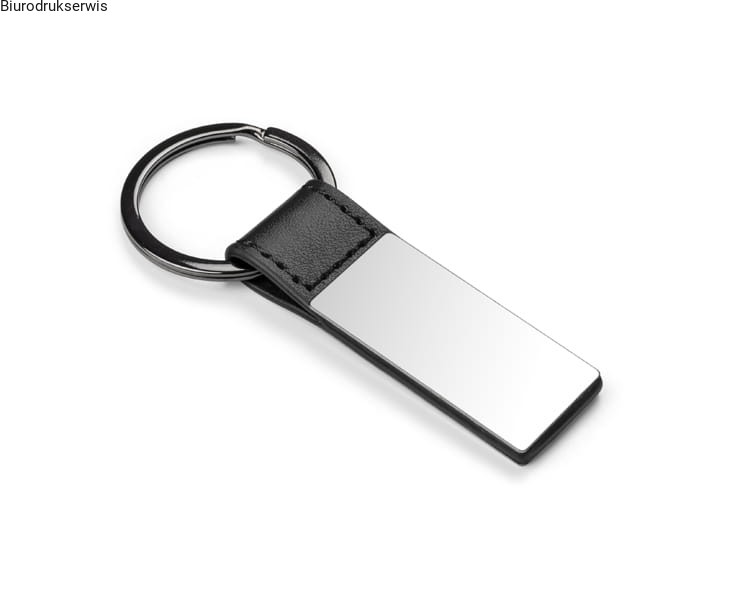 Elegancki dwustronny brelok wykonany z ekoskórki PU i metalu w kolorze grafitowym. Logo wygrawerujemy na metalowej blaszce.
