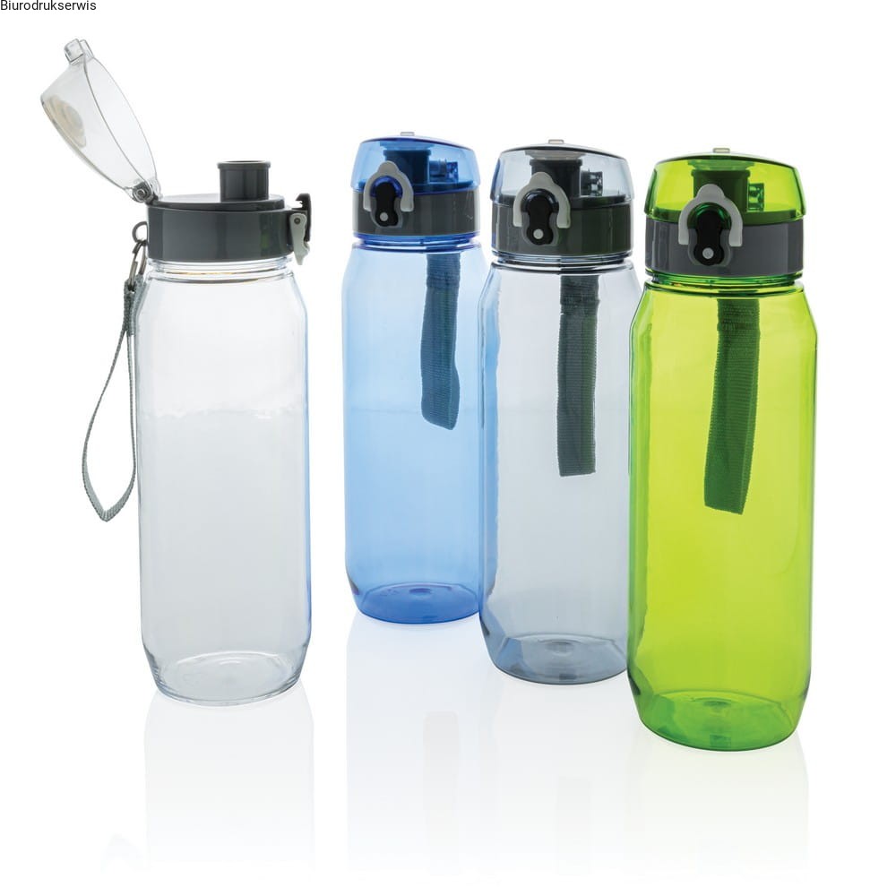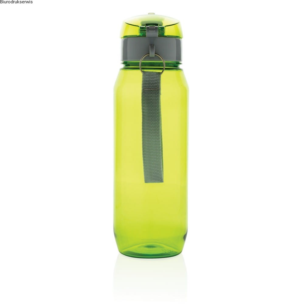Butelka sportowa 800 ml, wykonana z Tritanu, bezwonna, szczelne wieczko z blokadą i przyciskiem, nie wymaga obsługi oburącz, posiada pasek, nie zawiera BPA