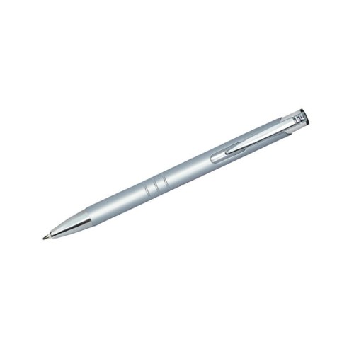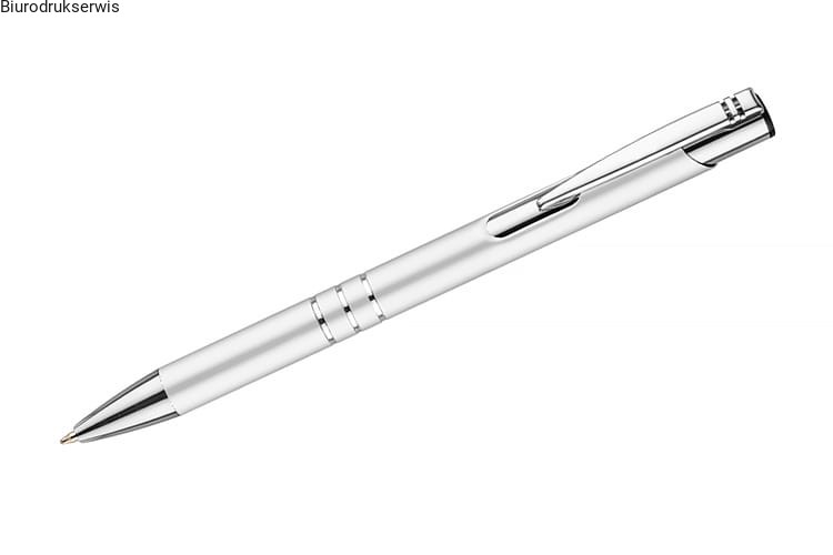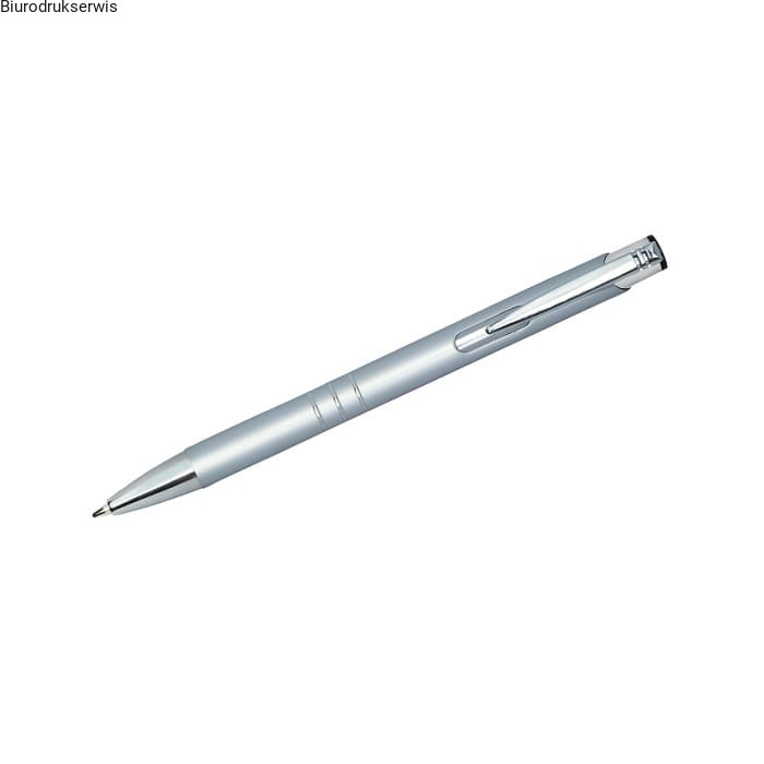 Metalowy długopis o metalizowanej chromowanej powierzchni. Długopis automatyczny z 3 ringami i niebieskim wkładem. Logo grawerujemy na powierzchni długopisu.