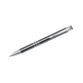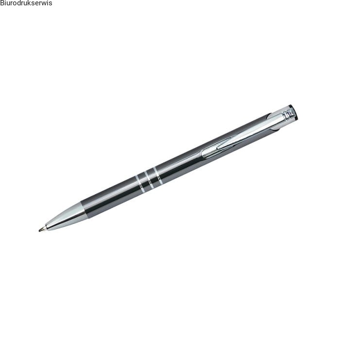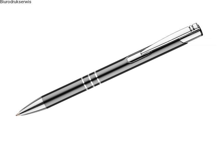 Metalowy długopis o metalizowanej chromowanej powierzchni. Długopis automatyczny z 3 ringami i niebieskim wkładem. Logo grawerujemy na powierzchni długopisu.