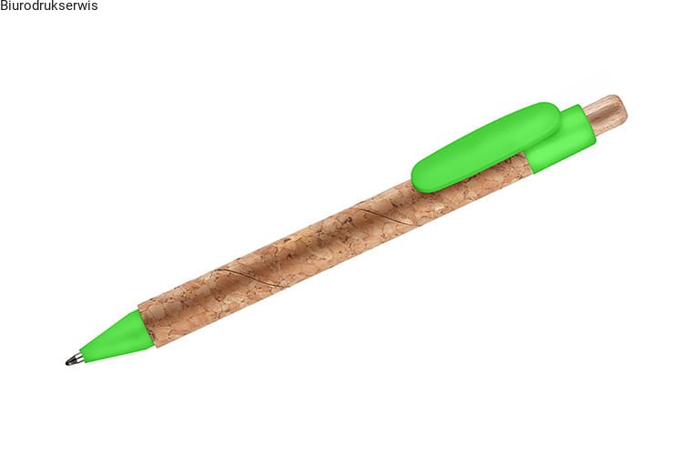 Długopis KORTE nawiązuje swoim wyglądem do idei recyclingu. Korpus został wykonany z naturalnego korka, a przycisk z drewna. Wykończenia z tworzywa sztucznego w żywych kolorach dodają mu uroku. Wkład w kolorze niebieskim.
