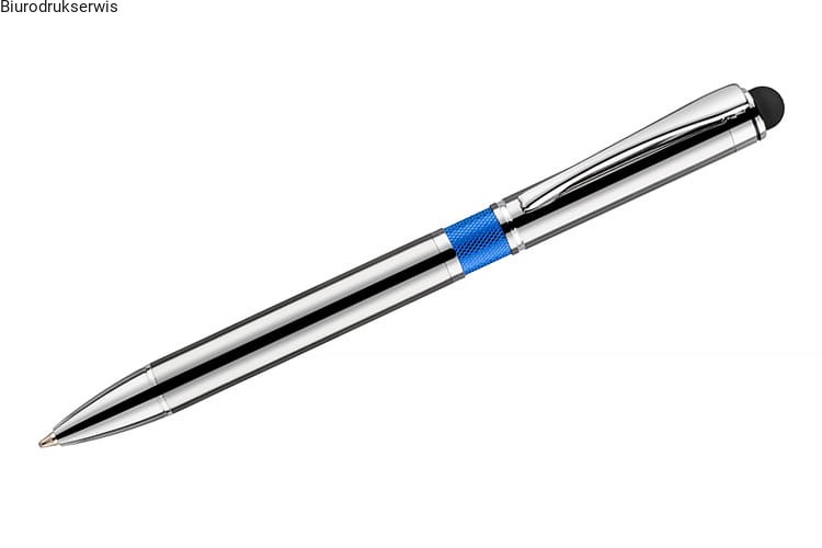 Elegancki metalowy długopis z kolorową aplikacją na korpusie oraz touchpenem.
