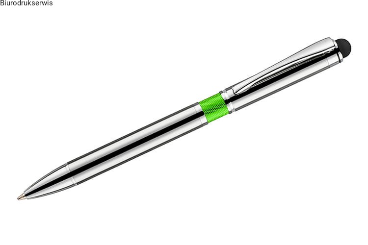 Elegancki metalowy długopis z kolorową aplikacją na korpusie oraz touchpenem.