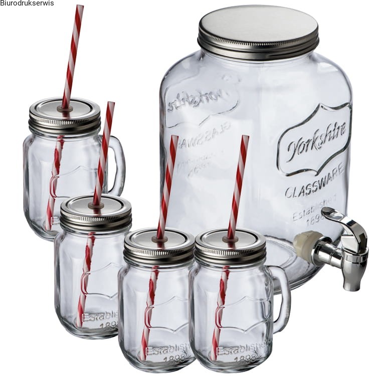 Dozownik do napojów (poj. 4000 ml.) w zestawie z czterema słoikami (poj. 450 ml.). Całość wykonana ze szkła. Logotyp można umieścić na metalowym wieczku dozownika.