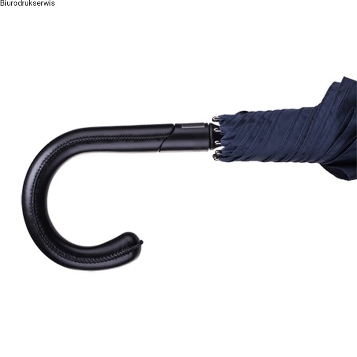 Elegancki automatyczny parasol z rączką wykonaną z wysokiej jakości ekoskóry. Pałąk, rama i żebra wykonane z włókna szklanego. ZDOBIENIA : sitodruk B5, rozmiar obszaru zdobienia: 250x152, maksymalny rozmiar logo: 250x150, ilość kolorów: 4