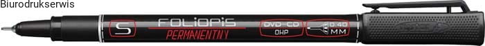 Foliopis z tuszem permanentnym,do stosowania na niemal wszystkich gładkich powierzchniach np.: CD, DVD, folii, szkle, metalu,końcówka pisząca o grubości: 0,4 mm,kolor czarny.