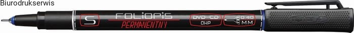 Foliopis z tuszem permanentnym,do stosowania na niemal wszystkich gładkich powierzchniach np.: CD, DVD, folii, szkle, metalu,końcówka pisząca o grubości: 0,4 mm,kolor niebieski.