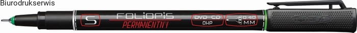 Foliopis z tuszem permanentnym,do stosowania na niemal wszystkich gładkich powierzchniach np.: CD, DVD, folii, szkle, metalu,końcówka pisząca o grubości: 0,4 mm,kolor zielony.