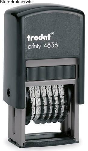 Numerator 4836 samotuszujący z serii Printy w eleganckiej obudowie wyprodukowanej w 70% z odzyskanego plastiku, przydatnedo znakowania dokumentów w każdym biurze, 6-cyfr. wysokość cyfr 3,8 mm.