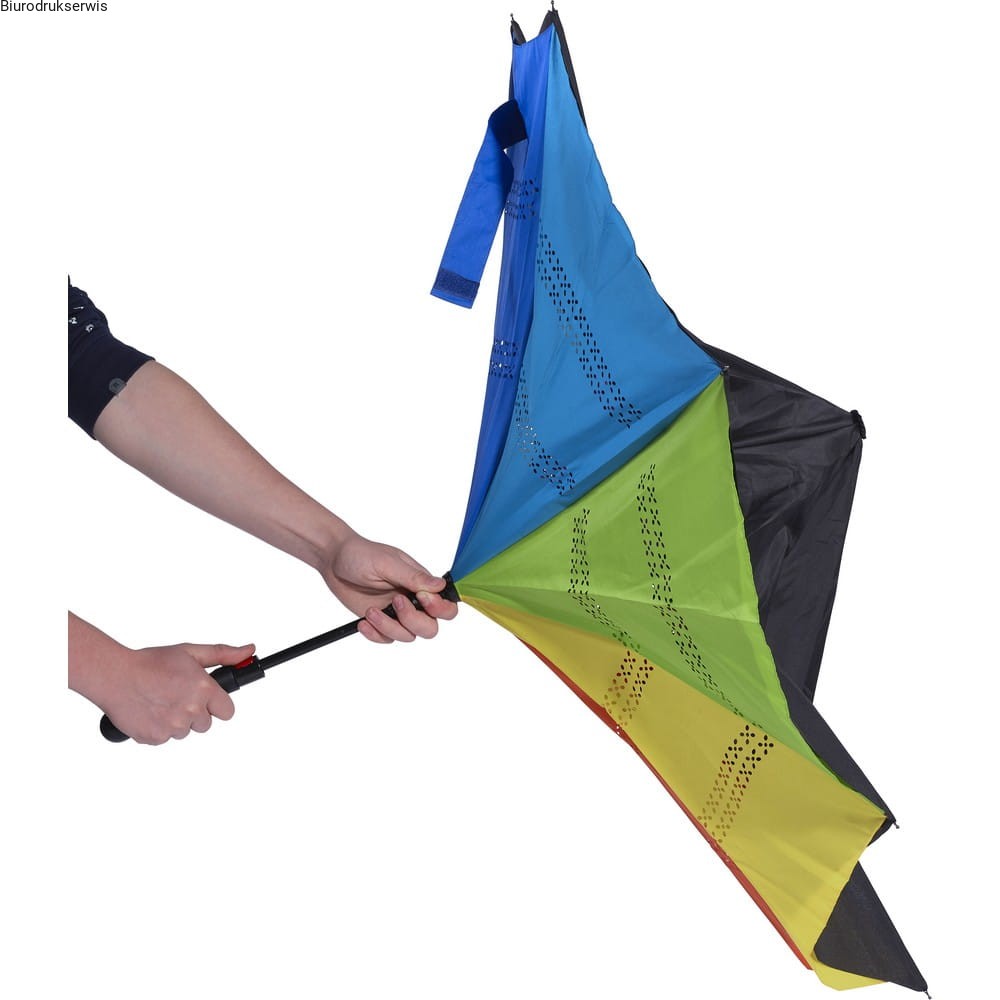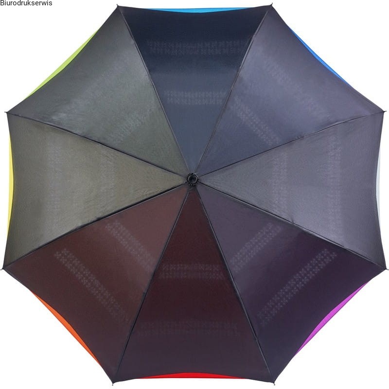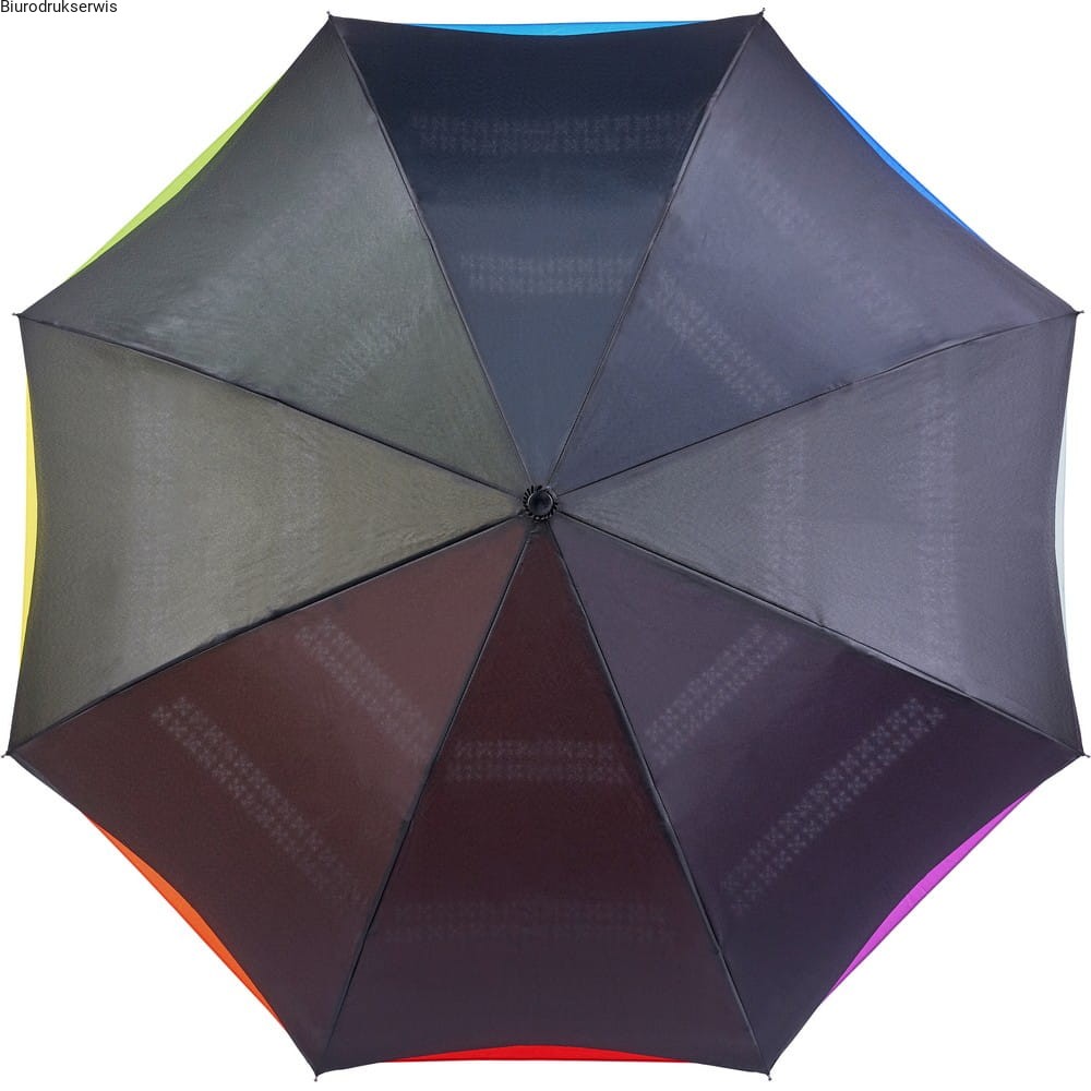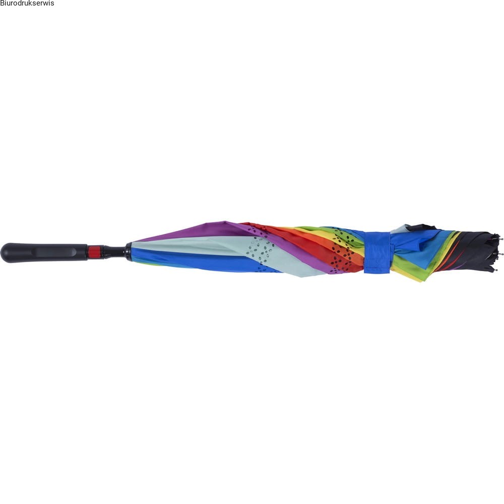 Odwracalny parasol automatyczny, 8 paneli, 2 warstwy materiału (czarny wierzch i wielokolorowy spód), metalowy trzon, stelaż z włókna szklanego, plastikowa rączka