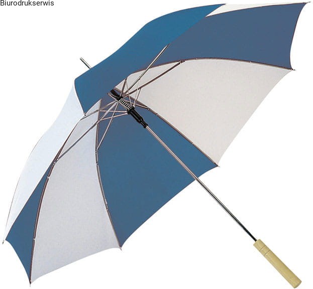 Parasol automatyczny z prostą, drewnianą rączką. Kolorowe segmenty łączone są na przemian z białymi, dzięki czemu parasol przyciąga uwagę.