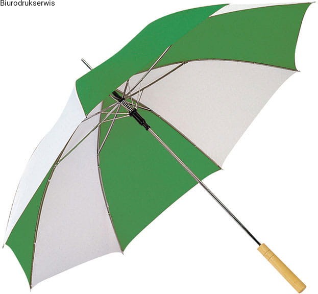 Parasol automatyczny z prostą, drewnianą rączką. Kolorowe segmenty łączone są na przemian z białymi, dzięki czemu parasol przyciąga uwagę.