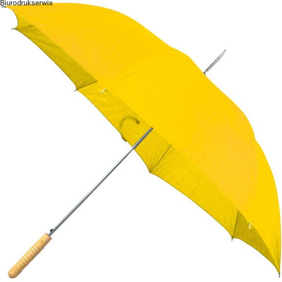 Automatyczny parasol z prostą, drewnianą rączką. Żywe kolory przyciągają wzrok, dzięki czemu parasol stanowi skuteczne medium reklamowe.