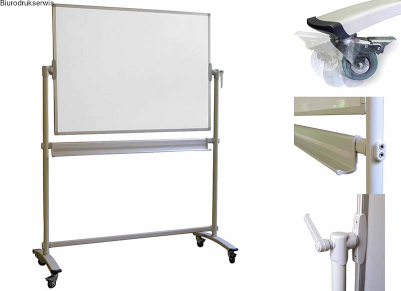 Tablica obustronnie suchościeralna magnetyczna w ramie aluminiowej anodowanej STANDARD, obrotowo – jezdna,powierzchnia tablicy wykonana ze stali lakierowanej w kolorze białym,konstrukcja metalowa w kolorze popielatym na 4 gumowych kółkach,stabilność tablicy, zapewnia system blokujący na wszystkich 4 kółkach,aluminiowa półka na markery wyposażona jest w plastikowe zaślepki, które mają za zadanie zwiększyć bezpieczeństwo podczas jej użytkowania,tablica przeznaczona do pisania suchościeralnymi markerami oraz do zawieszania kartek za pomocą magnesów.wymiary: 120 x 90 cm.