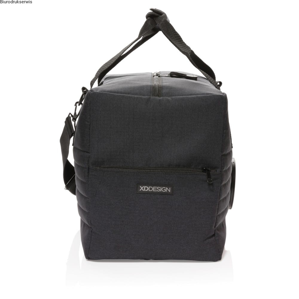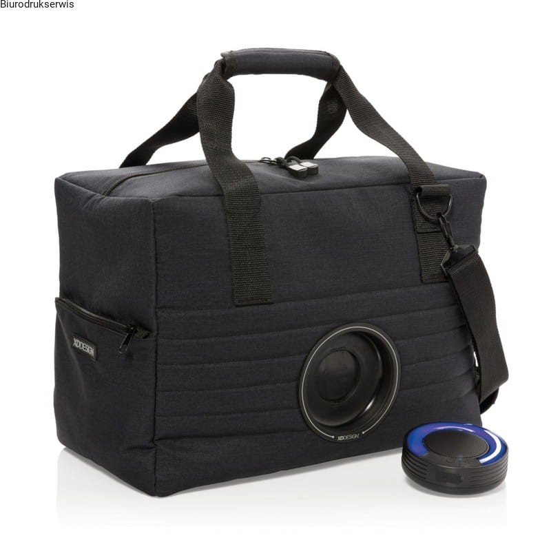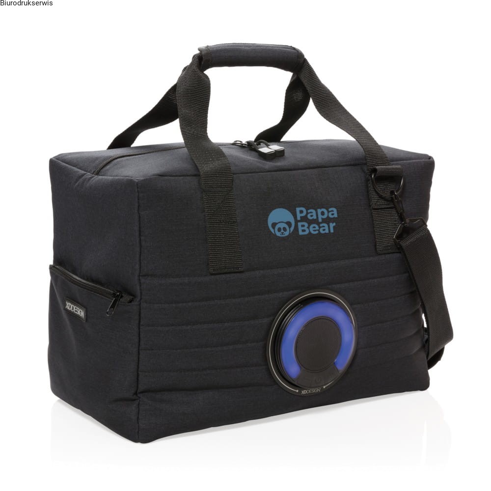 Duża nowoczesna torba termoizolacyjna z przenośnym głośnikiem. Głośnik jest również bezprzewodowy, wodoodporny IPX5 i posiada zmieniające kolor LED. Wystarczy przekręcić, aby go wyjąć i umieścić na swoim biurku. Torba pomieści do 32 puszek 0,33 L, a głośnik będzie odtwarzał muzykę do 5 godzin. Posiada również pasek na ramię. Wzór zastrzeżony®