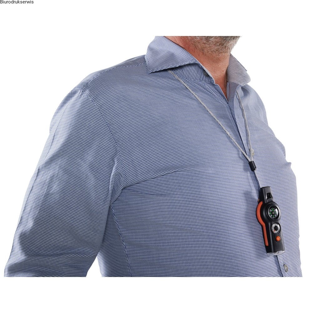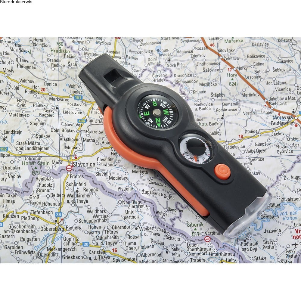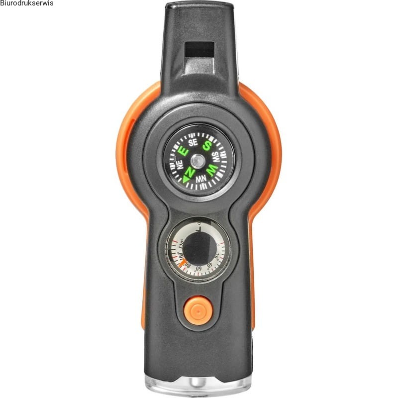 Wielofunkcyjne narzędzie przetrwania, funkcje: gwizdek, kompas, termometr (stopnie C i F), lampka, lusterko, szkło powiększające i sznurek z zabezpieczeniem
