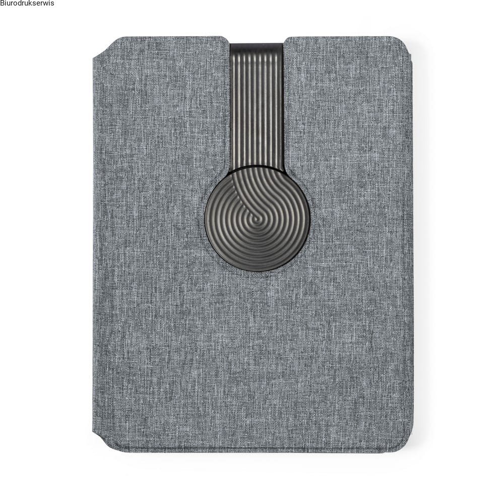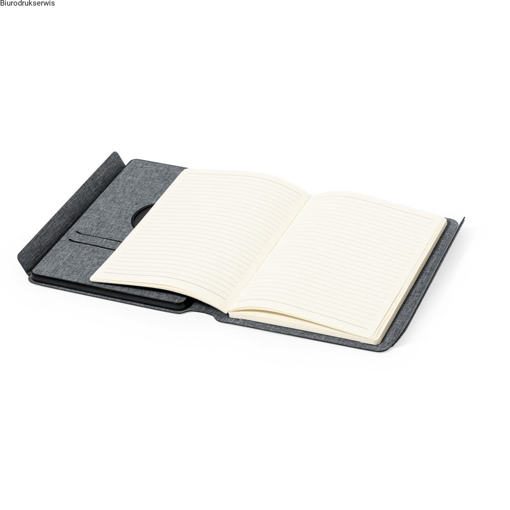 Wielofunkcyjny notatnik A5 (65 kartek w linie), wykonany z RPET, zamknięcie na magnes, magnetyczna ładowarka bezprzewodowa 10W, działa z telefonami posiadającymi możliwość ładowania indukcyjnego, funkcja magnetyczna działa tylko z kompatybilnymi urządzeniami, metalowy ring mocowany na taśmę w komplecie, power bank 5000 mAh, diody wskazujące poziom naładowania, wejście/wyjście USB typu C 5-9V/2.1-3A, stojak na telefon, przegródki na karty, kabel w komplecie