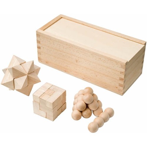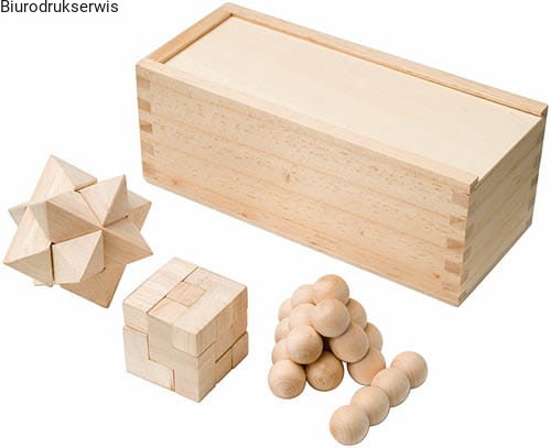Zestaw ekologiczny trzech układanek logicznych. Zestaw pakowany w skrzyneczkę, wykonany z drewna.